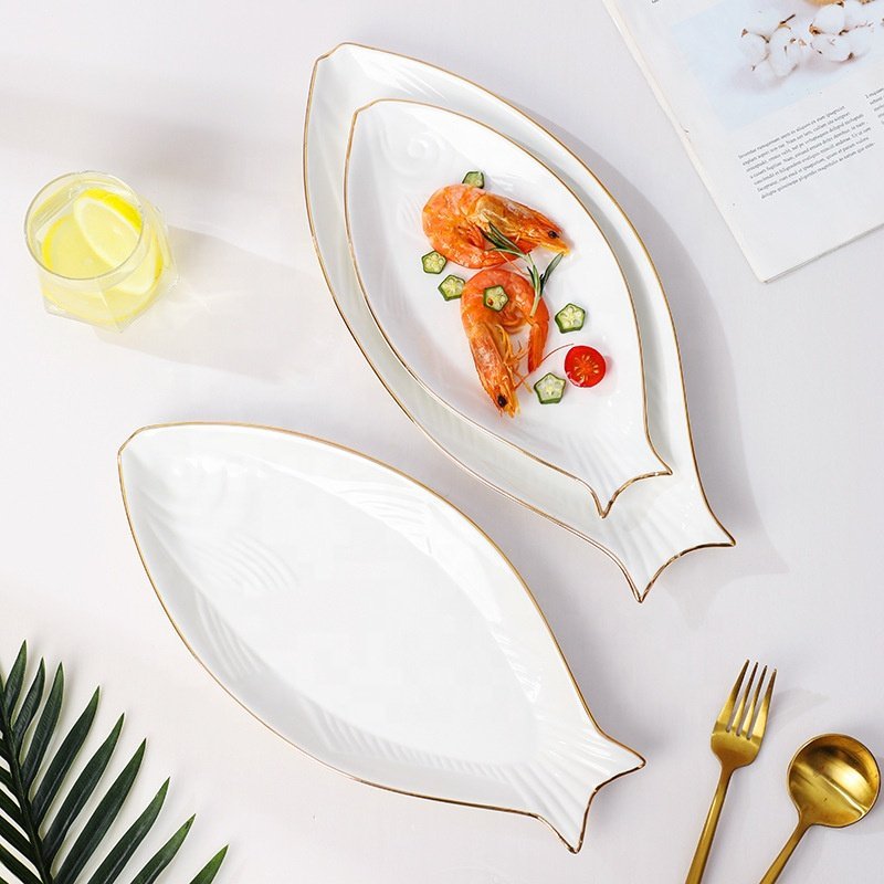 Luxury Gold Rim Fish Plate Kitchen Ceramic Dinner Plate For Hotel